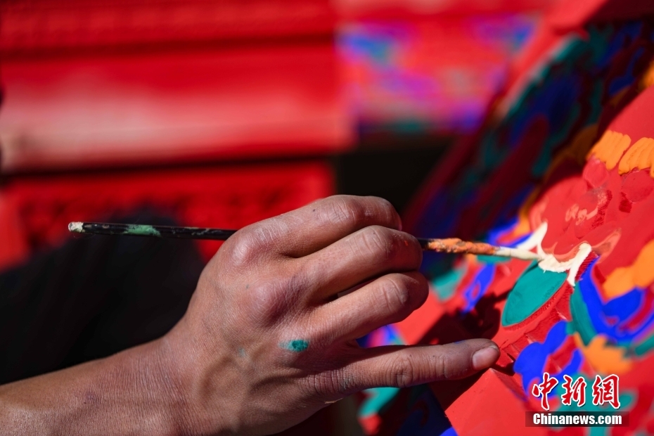12月28日,西藏拉萨堆龙德庆区,古俗民族传统手工艺发展专业合作社员工在家具上绘制藏式装饰。据悉,该合作社以绘画、木工、缝纫为主,承接传统手工艺方式制作家具、房子装修、唐卡绘画、旅游产品、文物建筑维修等工作。自2018年合作社成立至今,带动就业共60余人。 中新社记者 贡嘎来松 摄