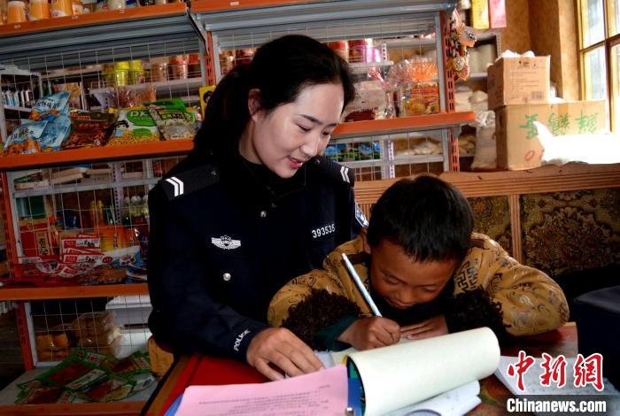 图为索朗曲珍为辖区儿童辅导作业。勒布边境派出所供图