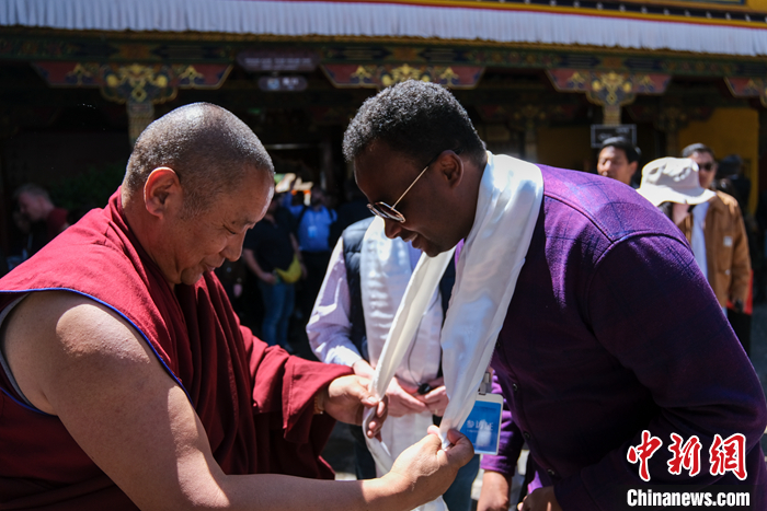 图为拉萨大昭寺僧人向来访嘉宾敬献哈达。 中新社记者 江飞波 摄