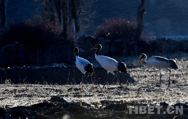 图为黑颈鹤在林周县境内的田野觅食 摄影:王媛媛