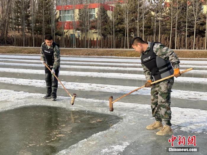 资料图为2020年12月28日,青海湖裸鲤救护中心工作人员在室外渔场破冰观察裸鲤活动情况。 中新社记者 李江宁 摄