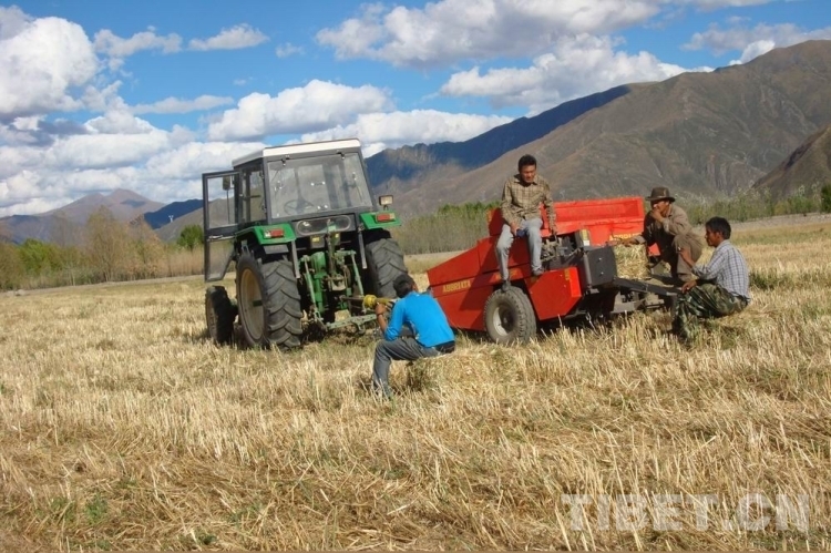 图为西藏自治区农牧科学院草业科学研究所科技人员正在开展饲用燕麦青干草打捆试验示范