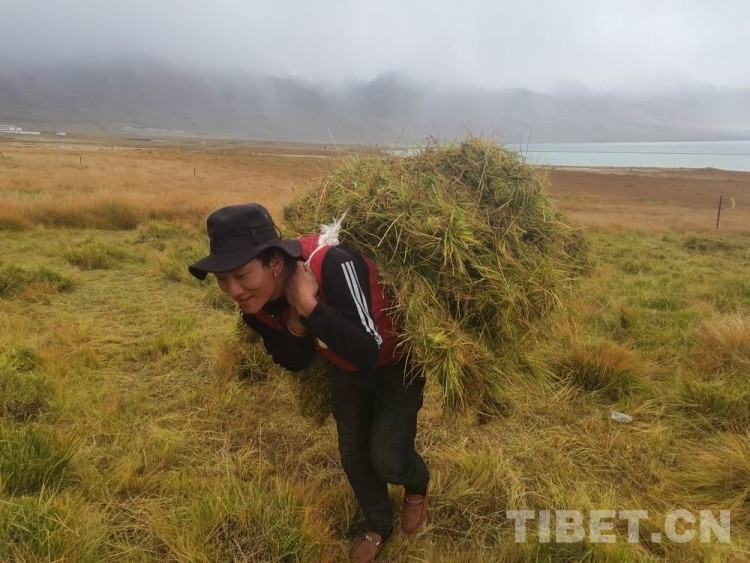 图为西藏自治区那曲牧民在天然草地刈割打草