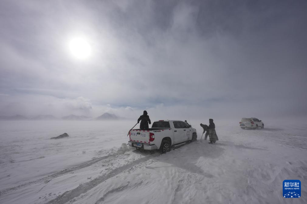 玛曲乡长江源党员环保志愿队巡逻途中车辆陷入雪中后进行自救(2024年2月2日摄)。新华社记者 晋美多吉 摄