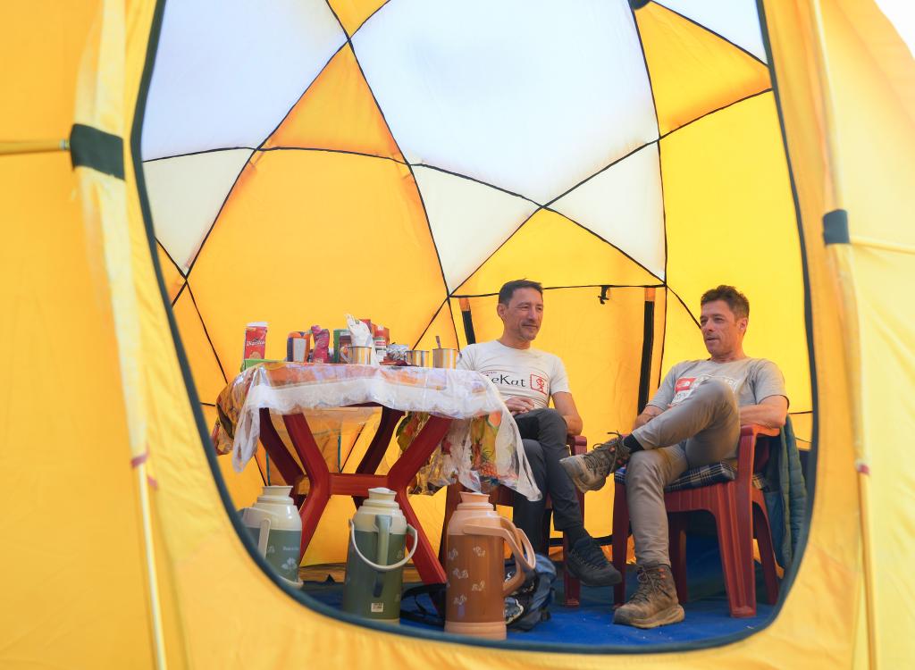 在珠峰登山大本营,帕斯卡尔·德诺埃尔(左)和多米尼克·德诺埃尔在帐篷里聊天休息(5月17日摄)。新华社记者 丁汀 摄