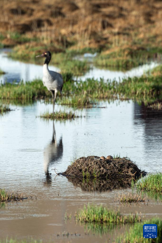 黑颈鹤在湿地孵蛋(6月7日摄)。新华社记者 姜帆 摄
