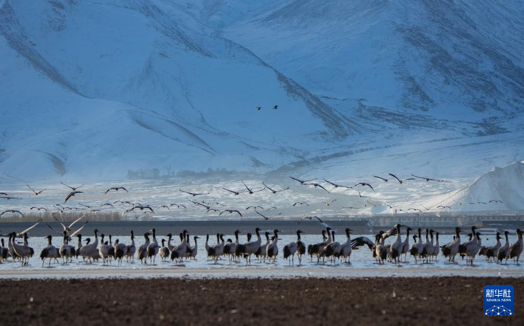 西藏自治区拉萨市林周县平均海拔约4200米,是黑颈鹤的主要越冬地之一。一场冬雪,将林周县虎头山水库染成一片银白,黑颈鹤仿佛是这洁白舞台优雅的舞者。