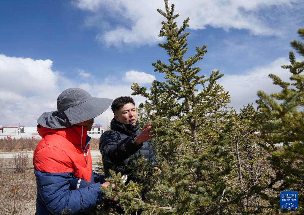 4月25日,那曲市林业和草原局工作人员在检查树木长势。新华社记者 丁增尼达 摄