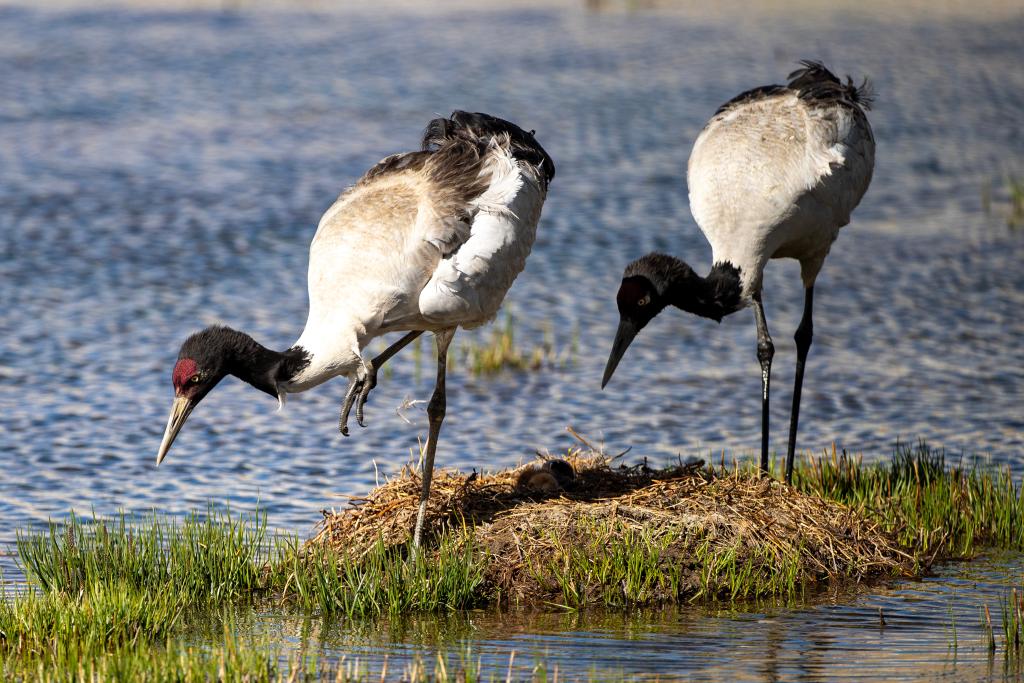 资料记载,黑颈鹤寿命大约为10到15年,通常一生中只有一个配偶;繁殖期在每年的5月至7月,求偶时伴随着舞动与共鸣——双双把头伸向前方,彼此呼应并发出“咯咯咯”的响声,这一行为相当于每年一次的“求婚”仪式。黑颈鹤营巢于水环绕的草墩上或茂密的芦苇丛中,一窝卵通常有2枚。