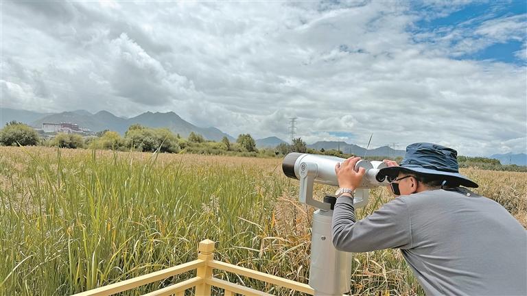 市民在拉鲁湿地公园内通过望远镜观赏布达拉宫。