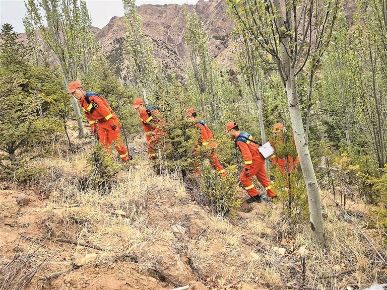 拉萨市森林消防大队官兵在南山公园执行巡逻任务。