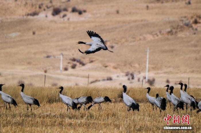 2月8日,在西藏林周县春堆乡卡东村周边越冬的黑颈鹤群。中新社记者 江飞波 摄