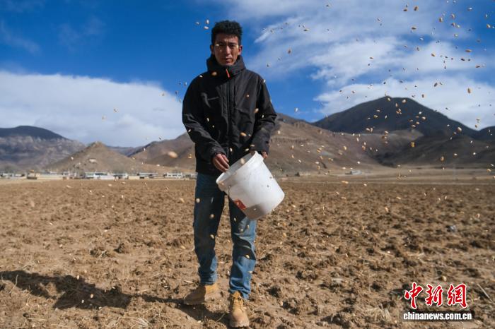 2月8日,西藏拉萨林周县黑颈鹤巡护员桑珠在田间播撒小麦,为黑颈鹤补充食物。中新社记者 江飞波 摄