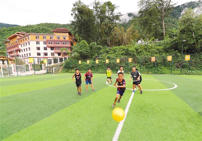 图为林芝市墨脱县墨脱镇墨脱村的孩子们在家附近的足球场上踢足球。格桑吉美