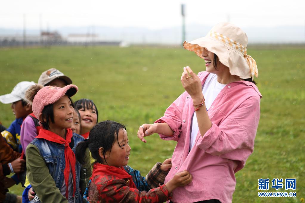 7月14日,河曲马场小学老师余妙妍(右一)在草原上和孩子们做游戏。新华社记者 陈斌 摄