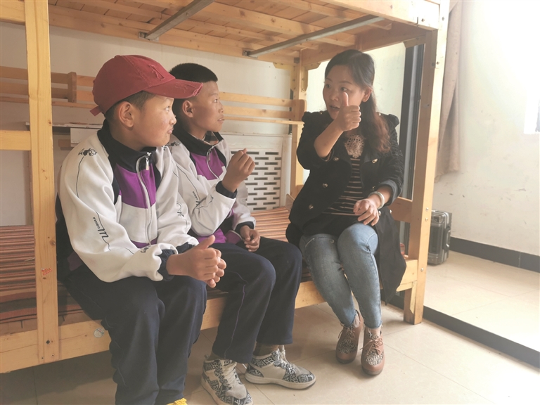 拉萨市特殊教育学校的老师谭倩和学生在宿舍里交流。