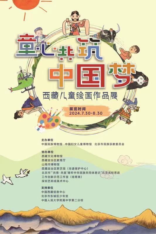 中国西藏网讯 7月30日,由中国民族博物馆、中国妇女儿童博物馆、北京市民族宗教事务委员会联合主办,西藏文化博物馆、西藏自治区教育厅、西藏自治区山南市博物馆、西藏自治区群艺馆(非遗保护中心)、北京市“‘共育·共美’铸牢中华民族共同体意识”北京高校思政工作创新示范工作室(培育类)、深圳艺邦成美术中心协办,中国西藏信息中心、北京市东城区少年宫、中国人民大学附属中学第二分校支持的“童心共筑中国梦——西藏儿童绘画作品展”在北京中国妇女儿童博物馆开展。国家民委、全国妇联有关领导出席开展仪式。