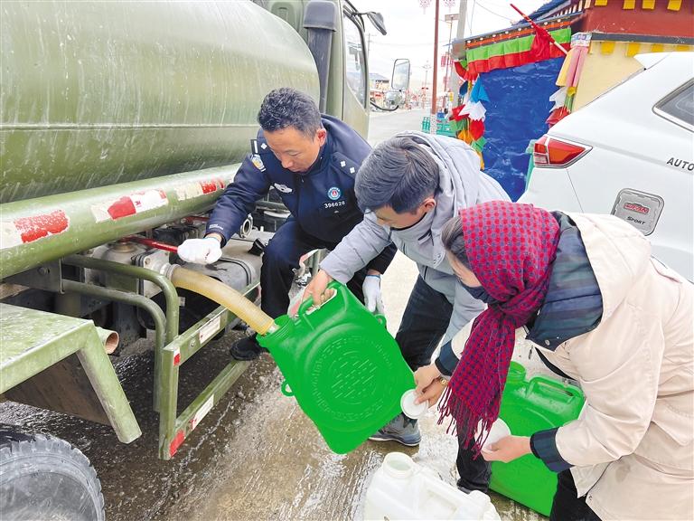 每年10月后,阿里地区便进入漫长的冬季。巴嘎乡岗莎村因塔尔钦曲河道结冰,当地群众生活用水十分困难。塔尔钦边境派出所组建党员服务小分队,每周都会按时调用水车从水井抽水,为辖区居民集中送水。