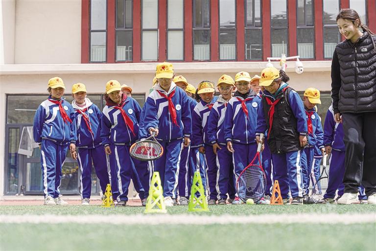 在互动环节,同学们分组进行了简单的网球对打练习,尽管大家大多是第一次接触网球,但在教练的鼓励下,都勇敢地挥起了球拍。每一次成功击球,都能引发周围同学的欢呼与掌声,孩子们脸上洋溢着自信和快乐的笑容。“以前只在电视上看过网球比赛,觉得这项运动很遥远,没想到今天能亲自体验,真的太有趣了,希望学校能经常组织网球课,我们一定会好好练习。”五年级一班的学生仁青达瓦兴奋地说。
