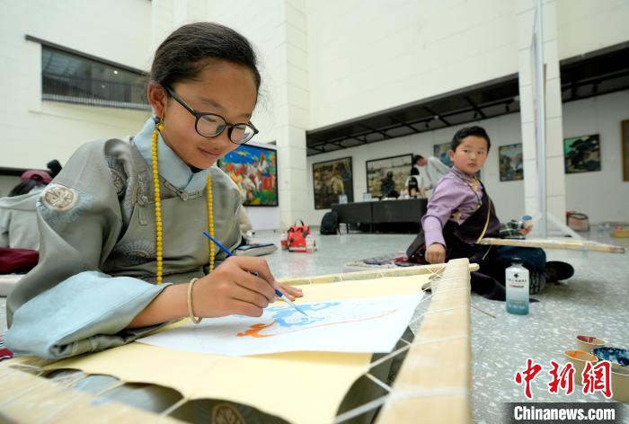 图为小朋友丹增熙珍体验唐卡绘制。中新社记者 李林 摄
