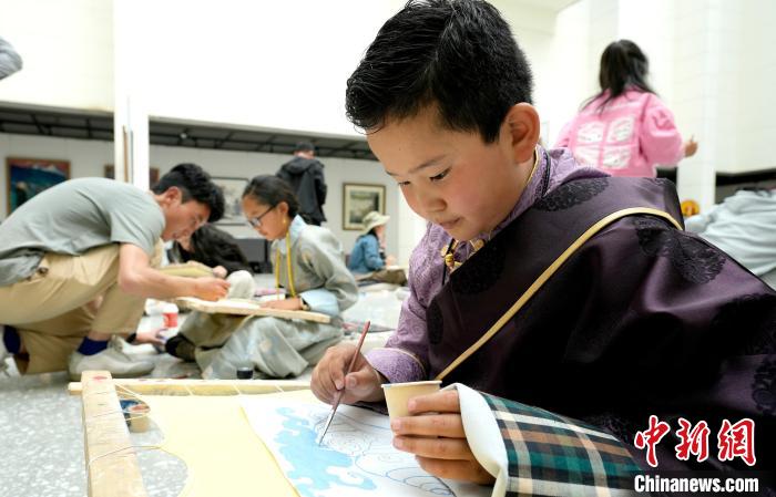 6月1日,西藏非物质文化遗产博物馆举办“非遗传承·文化交融”主题活动,当日为“六一”国际儿童节,活动以体验唐卡绘制为内容,让大朋友小朋友感受唐卡艺术的独特魅力。图为小朋友丹增雀珠在老师指导下体验唐卡绘制。中新社记者 李林 摄