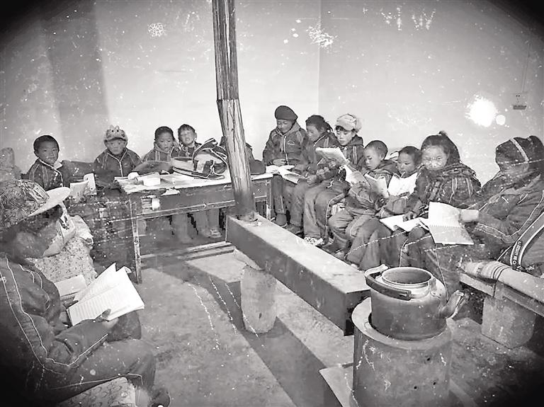 上世纪80年代,那曲县(色尼区)完全小学学生围坐在火炉旁上课。