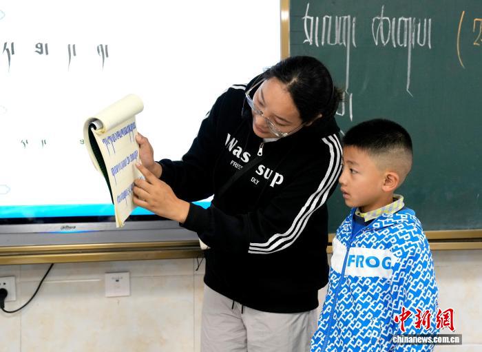 9月1日,拉萨市第一小学一年级二班,藏语文老师扎西央钦正在辅导学生。近日,西藏拉萨市秋季学期开学,各项教学工作有序开展。中新社记者 李林 摄