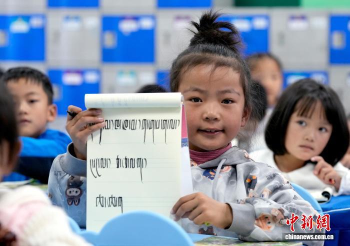 9月1日,拉萨市第一小学一年级二班的学生展示在藏语文课上书写的藏文。近日,西藏拉萨市秋季学期开学,各项教学工作有序开展。中新社记者 李林 摄