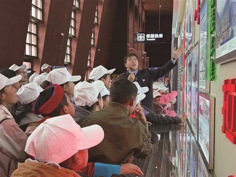 “这条全长435.48公里的铁路,桥隧比高达75%,结束了藏东南地区不通铁路的历史!”随着工作人员的讲解,同学们的目光追随着沙盘上的铁轨延伸,理解了这条铁路修建的困难程度,更读懂了这条铁路对“加强联系交流、维护民族团结”的重要意义。
