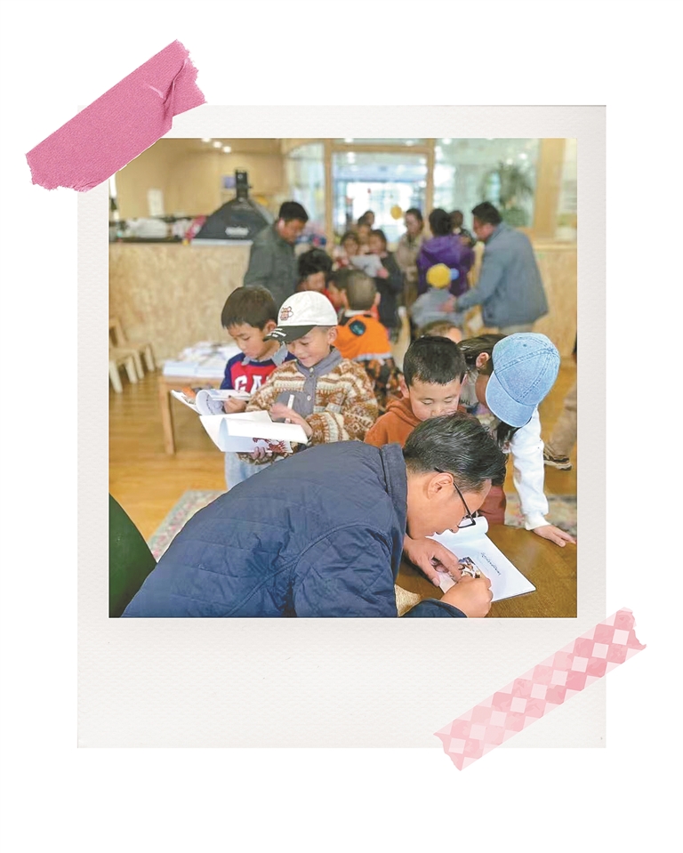图为嘎瓦占堆在绘本作品上为小读者签名。(图片由受访者提供)