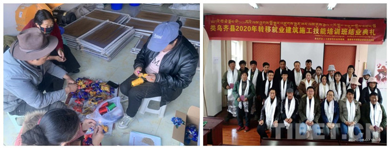 左图为类乌齐县农牧民通过加工手工艺品增收;右图为类乌齐县2020年转移就业建筑施工技能培训班结业典礼