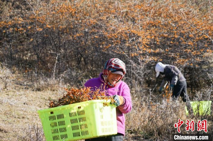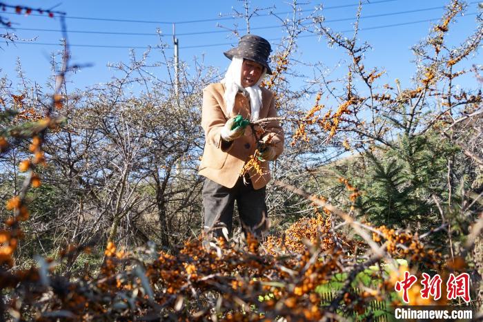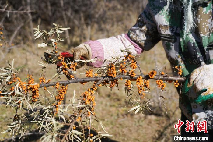 11月6日,在青海省西宁市湟源县一沙棘林中,村民采摘沙棘果。中新社记者 马铭言 摄