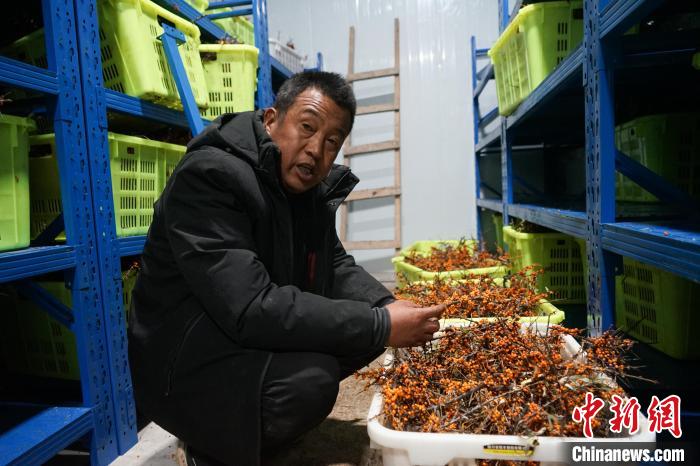 11月6日,在西宁市湟源县沙棘冷链基地内,负责人介绍,采摘后的沙棘果将在零下31度——零下35度的冷冻室进行速冻,方便后续加工。中新社记者 马铭言 摄