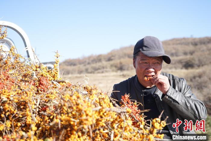 11月6日,在青海省西宁市湟源县一沙棘林中,村民品尝新鲜沙棘果。中新社记者 马铭言 摄