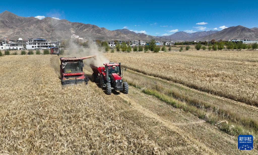 西藏日喀则市江孜县江热乡班觉伦布村农机服务农民专业合作社的社员使用农机收获青稞(10月16日摄)。新华社记者 晋美多吉 摄