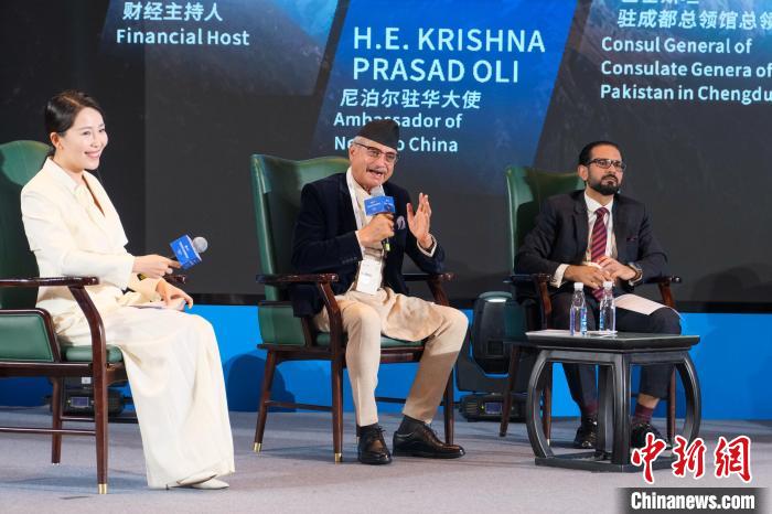 图为6月27日,尼泊尔驻华大使(中)与巴基斯坦驻成都总领馆总领事(右)在“环喜马拉雅”企业家国际会议上参与对话活动。江飞波 摄