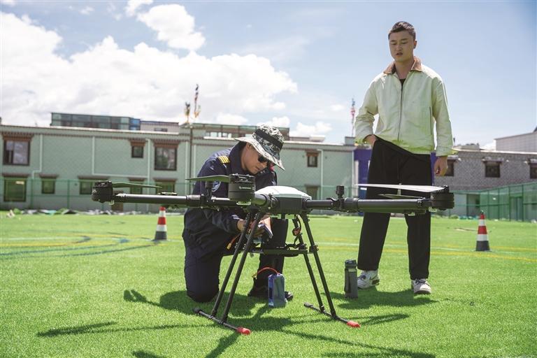 “低一点、再低一点。好,转圈。”8月20日,记者来到西藏藏泱阔低空科技有限责任公司时,边巴次仁正神情专注地和无人机教官一起熟练地操作着无人机。教官的双手在遥控器上操控着,边巴次仁的目光则紧紧锁定无人机的飞行轨迹,时不时提醒几句。
