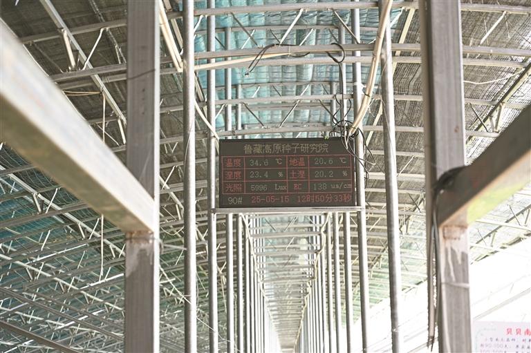 大棚上方悬挂着一面屏幕,显示着棚里的温度、湿度、光照等数据。鲁藏高原种子研究院驻院专家、山东省农业科学院蔬菜研究所党委副书记张立峰介绍说,通过这个屏幕,研究员能实时掌握棚里的情况,可根据需要进行远程监测和调控。