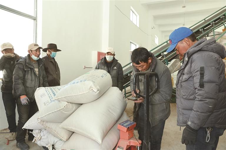 收购点工作人员正在对青稞进行称重。文/图 通讯员 洛克 记者 张雪芳
