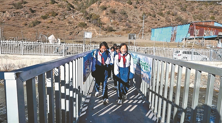 则巴乡第二小学的学生开心地走在驻村工作队新修建的便桥上。