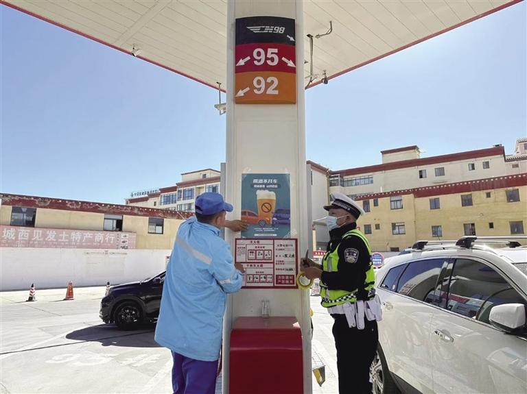 民警在加油站粘贴交通安全宣传海报。图由拉萨交警提供