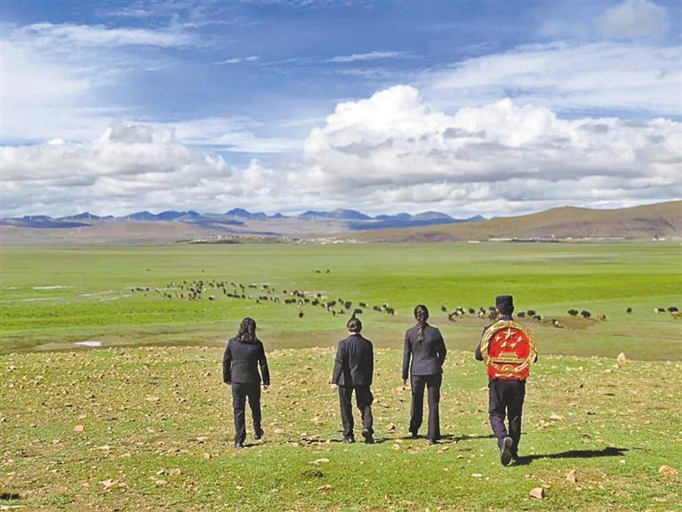 在广袤的草原深处,牧民群众的黑帐篷与成群的牛羊构成人与自然和谐共生的画卷。措美县人民法院干警来到放牧点,围坐于牧民群众间,用通俗易懂的语言打开话匣子。“大叔,您看这草场上的植被,要是过度放牧,来年就长不出这么好的草了,牛羊没了口粮,咱们的日子也受影响不是?”