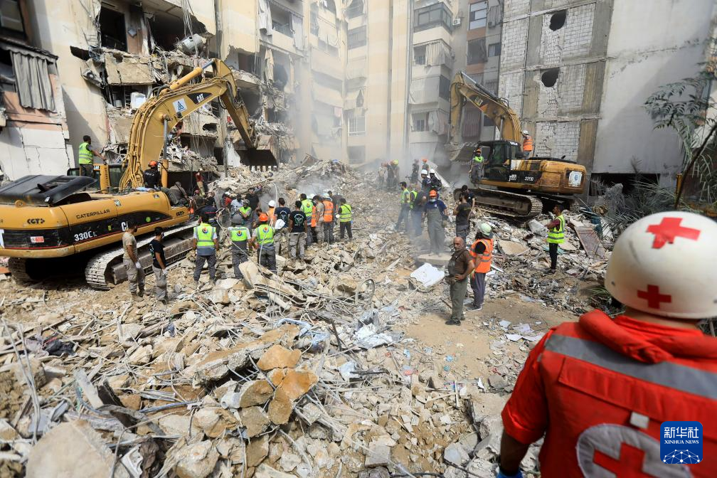 9月21日,救援人员在黎巴嫩贝鲁特的袭击现场工作。新华社发(比拉尔·贾维希摄)