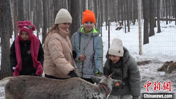 3月23日,内蒙古敖鲁古雅鄂温克民族乡,俄罗斯青少年与驯鹿合影。 刘明泽 摄