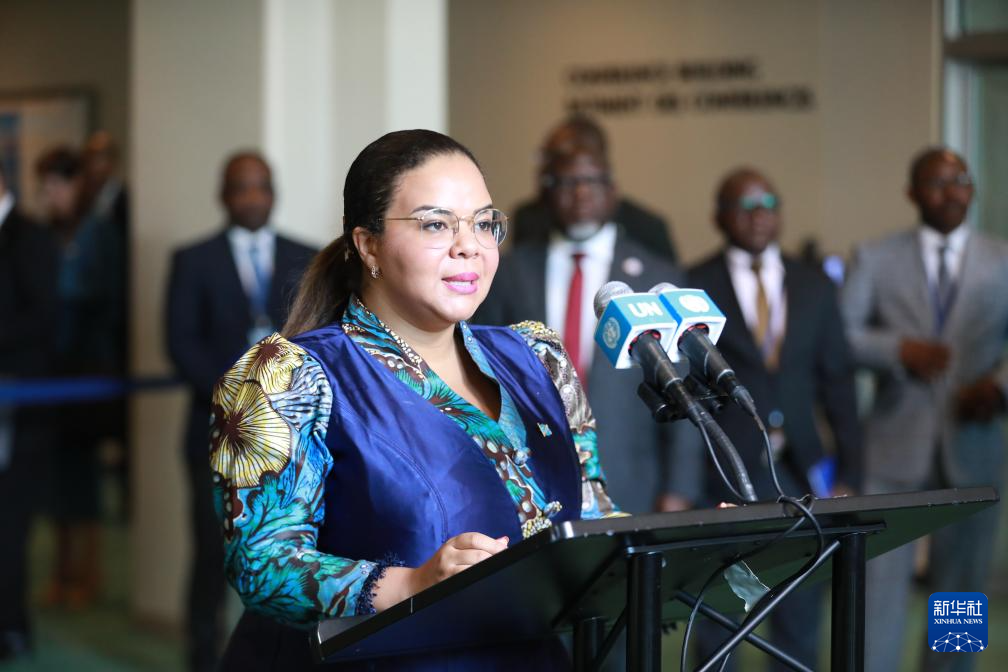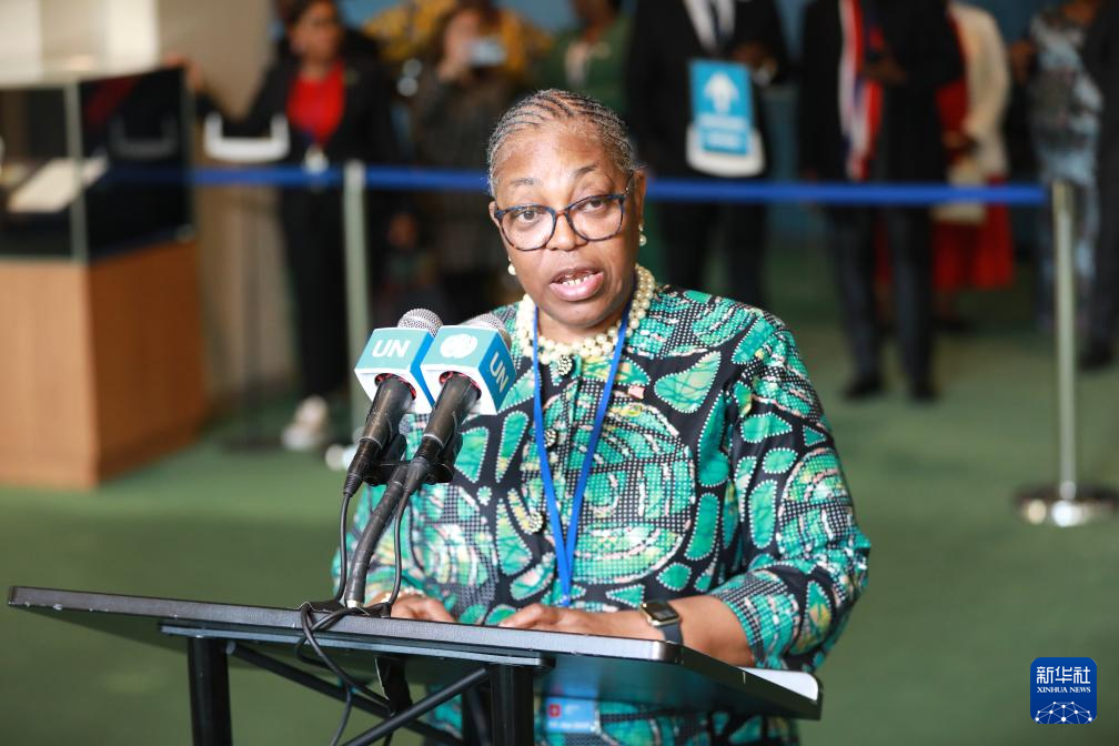 6月3日,在位于纽约的联合国总部,刚果(金)外长泰蕾兹·卡伊宽巴·瓦格纳在刚果(金)当选联合国安理会非常任理事国后讲话。新华社记者 谢锷 摄