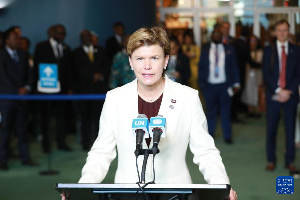 6月3日,在位于纽约的联合国总部,拉脱维亚外长拜芭·布拉泽在拉脱维亚当选联合国安理会非常任理事国后讲话。新华社记者 谢锷 摄