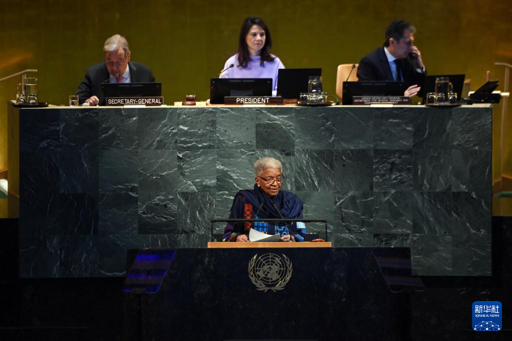 9月22日,在位于纽约的联合国总部,挪威前首相、世界卫生组织前总干事格罗·哈莱姆·布伦特兰(前)在纪念联合国成立80周年高级别会议上讲话。新华社记者 李睿 摄