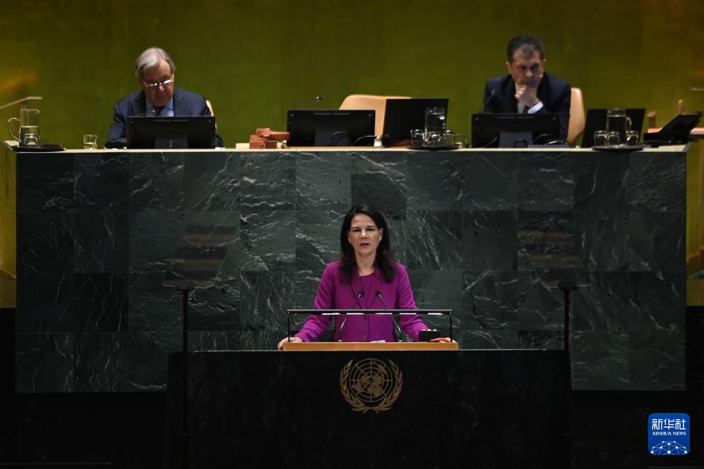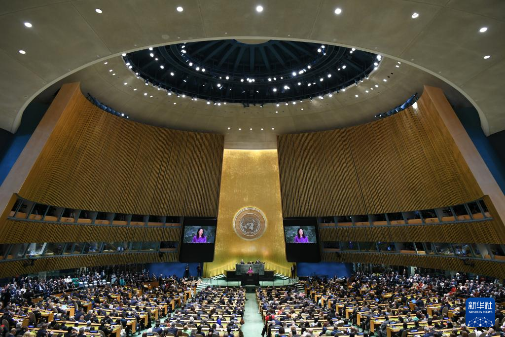 9月23日,在位于纽约的联合国总部,第80届联大主席贝尔伯克(中)主持第80届联合国大会一般性辩论开幕式。新华社记者吴晓凌摄