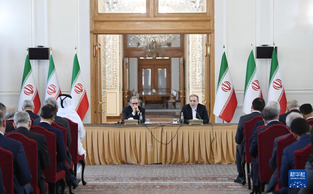10月5日,在伊朗首都德黑兰,伊朗外交部长阿拉格齐(右)出席与多国驻伊朗外交人员举行的会议。新华社记者 沙达提 摄