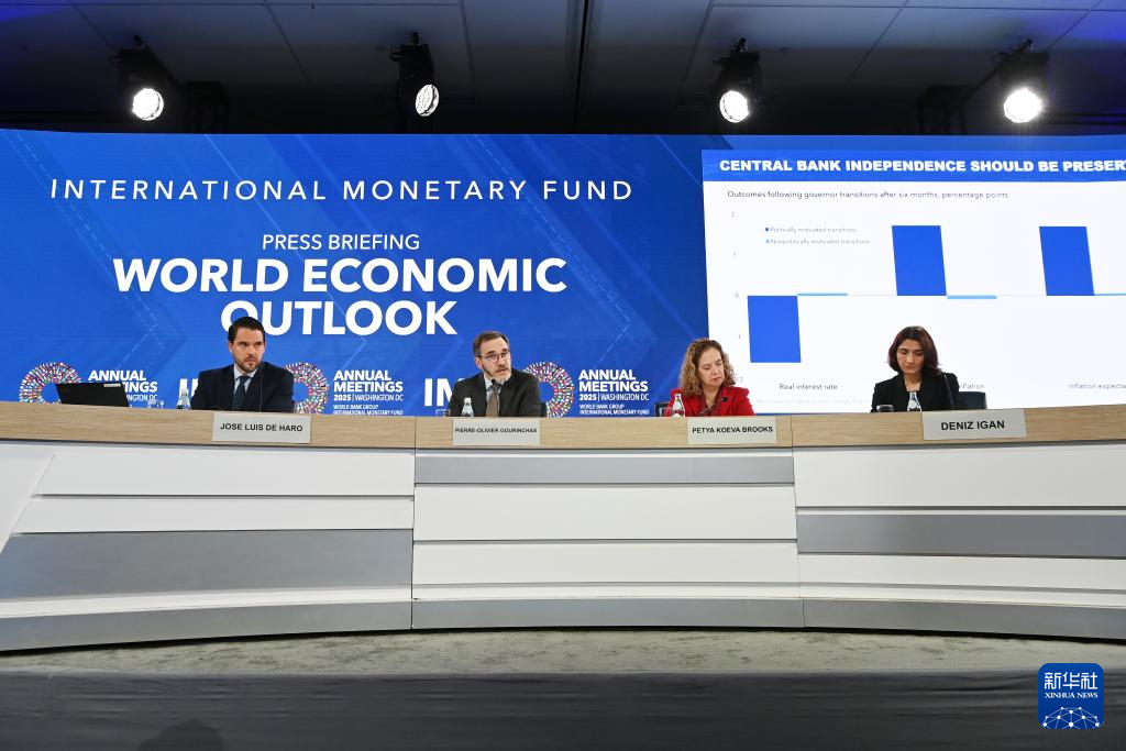10月14日,在美国华盛顿,国际货币基金组织首席经济学家皮埃尔-奥利维耶·古兰沙(左二)在《世界经济展望报告》新闻发布会上讲话。新华社记者 李睿 摄